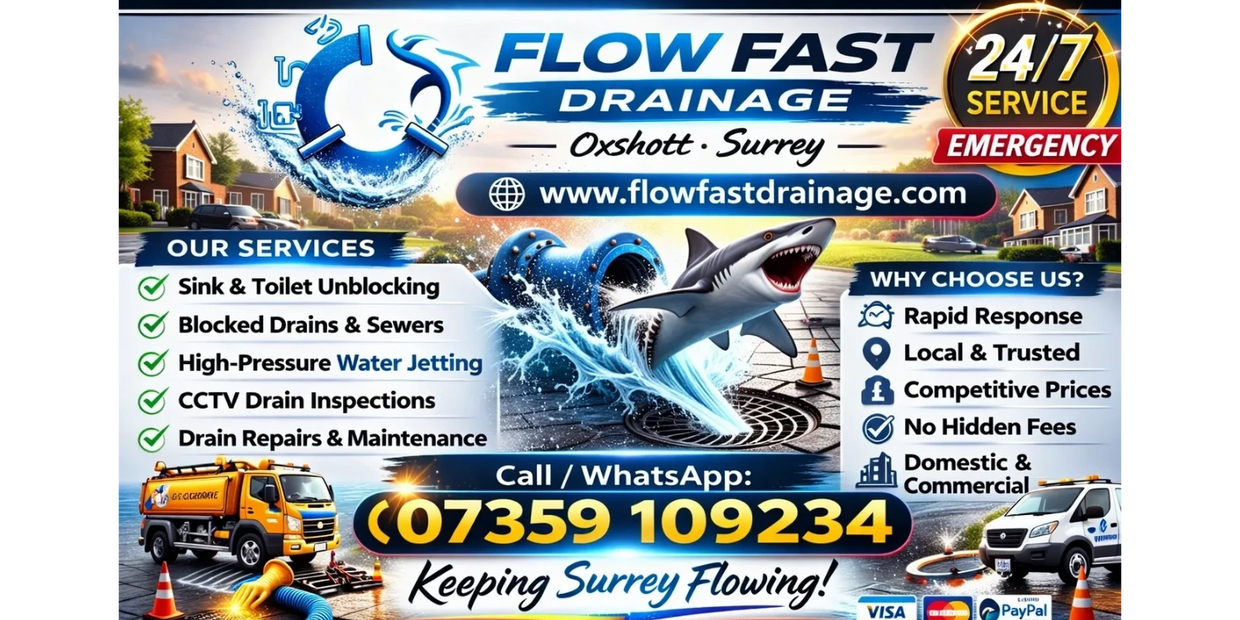 Flow Fast Drainage is a local, independent drainage service providing fast, reliable help for blocked drains, sinks and toilets across Weybridge, Epsom, Cobham and Esher, as well as surrounding parts of Surrey.